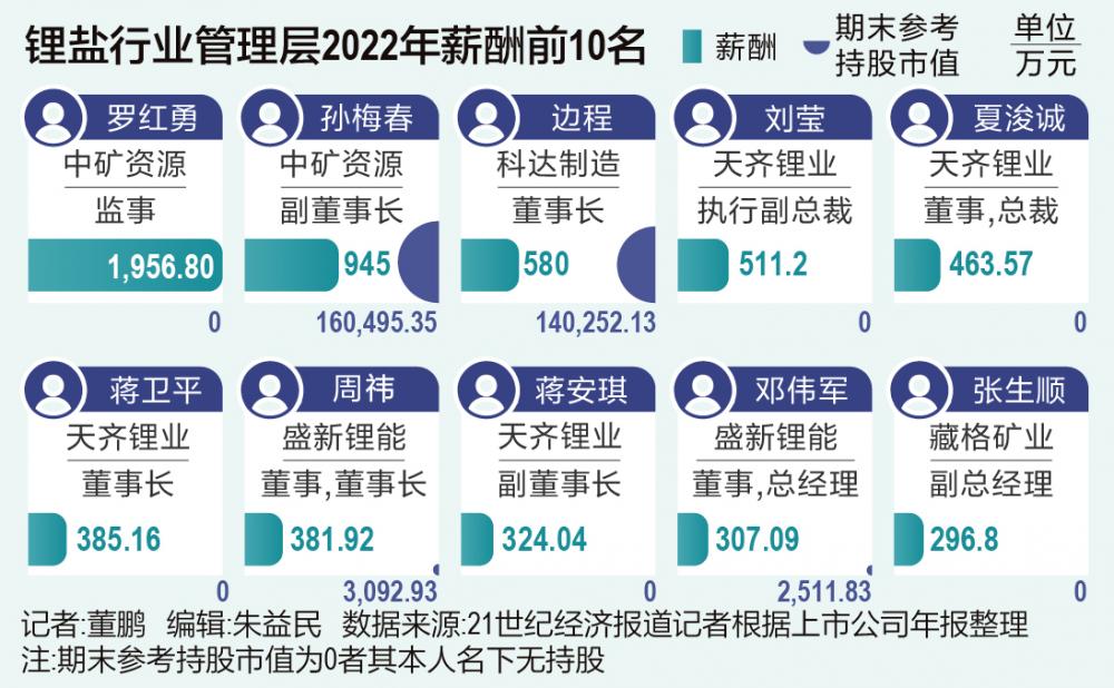 除了中矿资源的罗红勇外,天齐锂业执行副总裁刘莹、总裁夏浚诚薪酬业内前排领跑,但是此二人2022年末无直接持股。