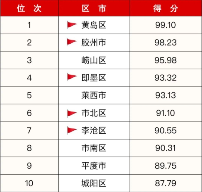 再来看位其他区市,其中“最亮眼”的当属李沧区。在此次排位中,李沧区与即墨区、市北区提升2个及以上位次,夺得“加压奋进、进位赶超”红旗。
