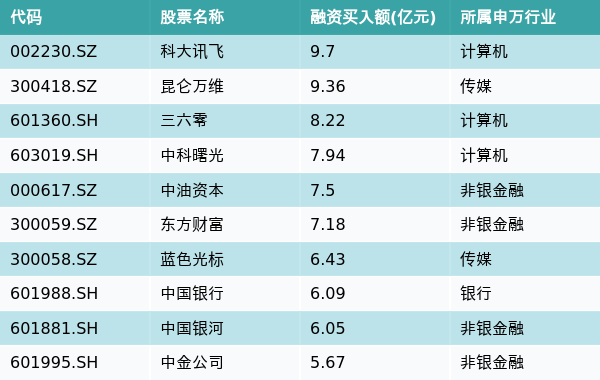 5月10日,两市共有3140只个股有融资资金买入,其中科大讯飞、昆仑万维、三六零排名前三,买入金额分别9.7亿元、9.36亿元、8.22亿元。融资买入额前10个股详情见下表: