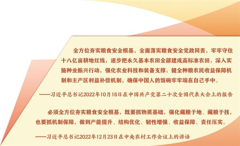粮食安全是“国之大者”,是国家安全的重要基础。党的二十大报告提出,“全方位夯实粮食安全根基”“确保中国人的饭碗牢牢端在自己手中”。这为我们做好粮食安全工作、切实保障国家粮食安全提供了根本遵循和行动指南。落实这一重要要求,需要全方位系统性地审视和解决粮食安全面临的问题,统筹谋划、综合施策,加强粮食生产、储备、稳链、增效、抗灾五大能力建设,夯实粮食安全根基。