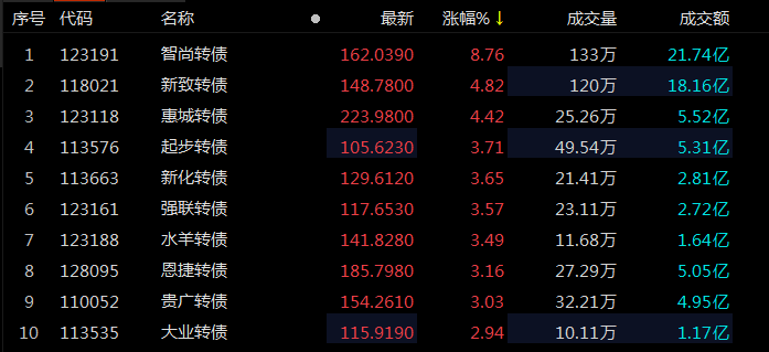 今日(5月11日),中证转债指数走强,截至发稿该指数涨0.30%,智尚转债涨近9%,新致转债、惠城转债涨超4%,起步转债、新化转债、强联转债、水羊转债、恩捷转债、贵广转债涨超3%。