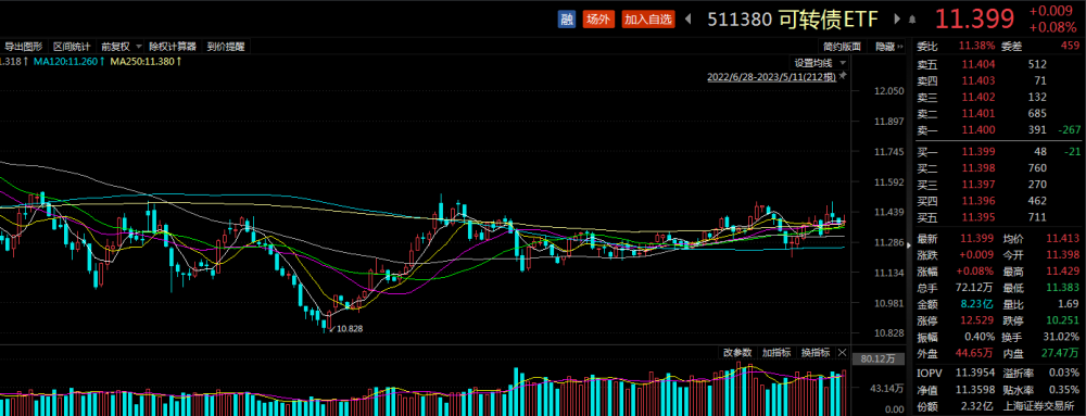 公开资料显示,可转债ETF(511380)跟踪中证转债及可交换债指数(931078.CSI),截至5月10日,该ETF今年来年化收益达到10.58%,在一众债券型ETF中收益居前。