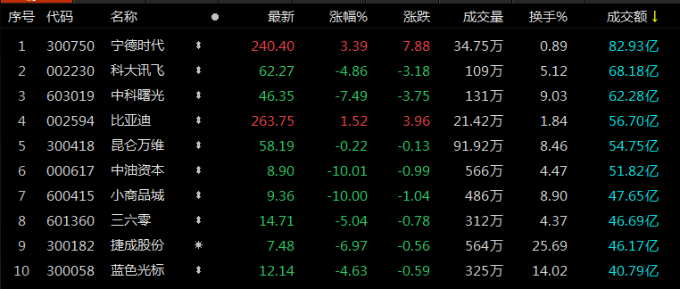 沪深两市全天成交8959亿元,终结连续24日万亿阶段纪录。个股方面,宁德时代成交额82.93亿元居首,科大讯飞、中科曙光、比亚迪等成交额居前。