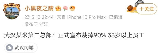 此前,有博主称,“武汉某米第二总部:正式宣布裁掉90% 35岁以上员工。”