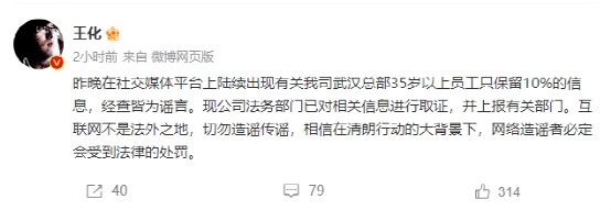 5月14日,小米集团公关部总经理王化发布声明称,“昨晚在社交媒体平台上陆续出现有关我司武汉总部35岁以上员工只保留10%的信息,经查皆为谣言。现公司法务部门已对相关信息进行取证,并上报有关部门。”