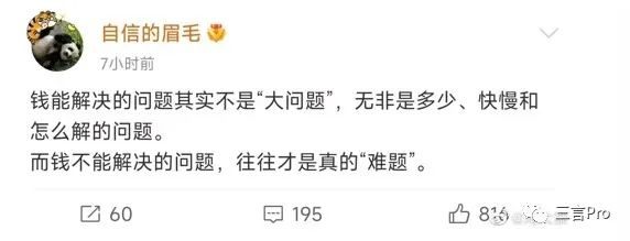 随后又发一条微博:“钱能解决的问题其实不是‘大问题’,无非是多少、快慢和怎么解的问题。而钱不能解决的问题,往往才是真的‘难题’”。