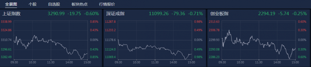 大盘全天震荡调整,三大指数均小幅下跌,沪指再度失守3300点。南财金融终端显示,截至收盘,沪指跌0.6%,深成指跌0.71%,创业板指跌0.25%。