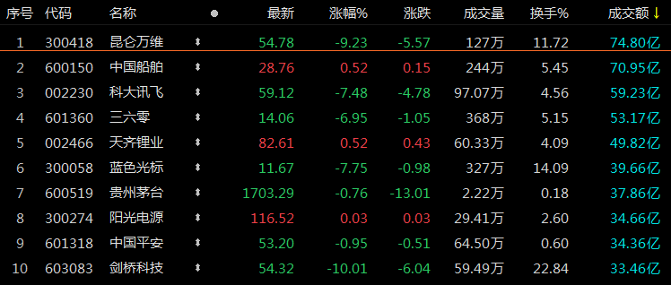 昆仑万维成交额居首,为74.80亿元。其次是中国船舶、科大讯飞、三六零、天齐锂业,成交额分别为70.95亿、59.23亿元、53.17亿元、49.82亿元。