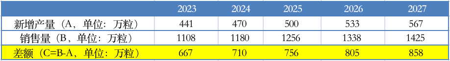 以2022年的1040万粒为起点,假设未来三年每年销量增长为上述测算的6.5%,那么2023、2024、2025年实际销售量和新增生产量的的差额则分别为667万粒、710万粒、756万粒,合计2142万粒,和上文测算的2248万粒相差不大。