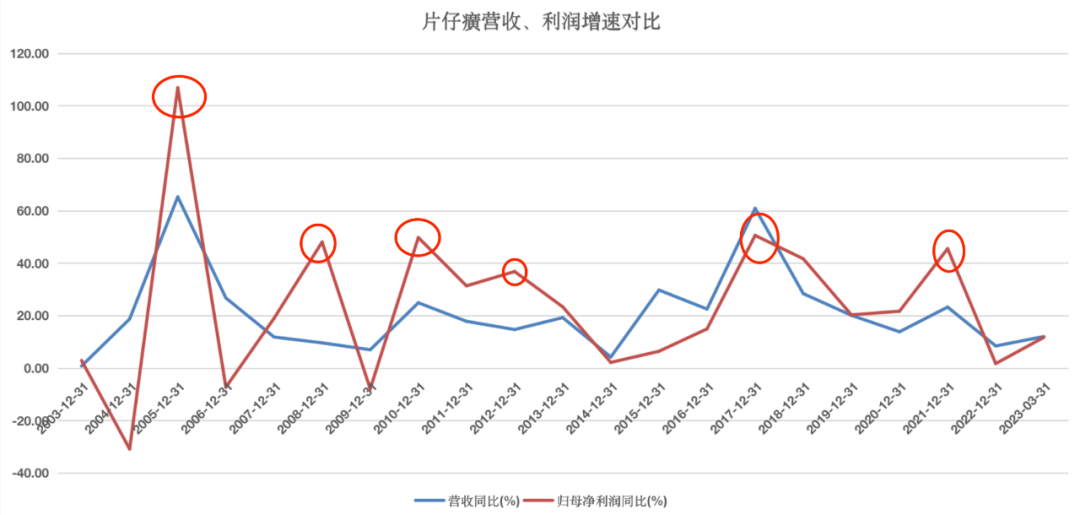 而从对利润的拉动效果来看,如下图所示,在多数提价年份,片仔癀利润增速都会拐头向上。
