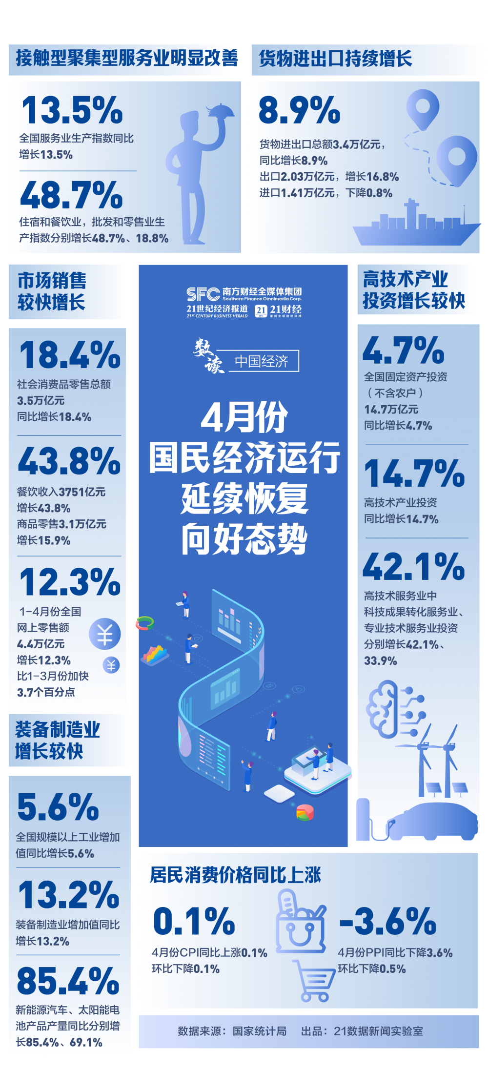5月16日,国家统计局公布最新经济数据。总的来看,4月份经济社会全面恢复常态化运行,多数生产需求指标同比增速提升,服务业和消费恢复较快,就业物价总体稳定,经济运行延续恢复向好态势。