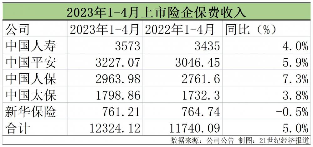 南方财经全媒体记者 孙诗卉 上海报道,近日,各大上市险企陆续披露1-4月保费收入公告,2023年1-4月五家A股上市险企共揽保费12324.12亿元,较去年同期增长5%。