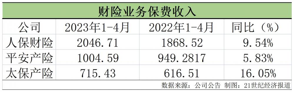 从增速来看,人保财险2023年1-4月实现保费收入2046.71亿元,较上年同期增长9.54%,但较一季度增速有所放缓;平安产险2023年1-4月实现保费收入1004.59亿元,较上年同期增长5.83%,增速较一季度的5.4%进一步提高;太保产险2023年1-4月实现保费收入715.43亿元,较上年同期增长16.05%,较一季度的16.76%有所降低。