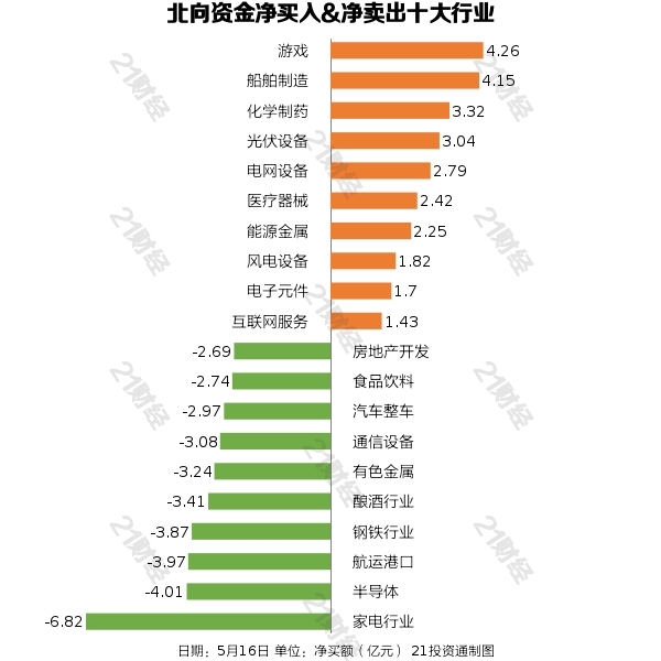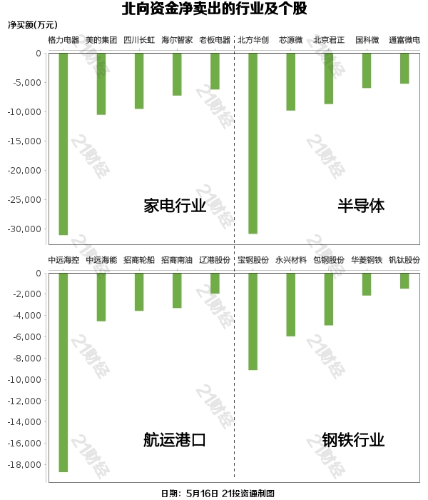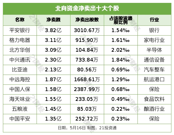 据21投资通智能监测,5月16日,北向资金净卖出34.01亿元,其中沪股通净买入1.47亿元,深股通净卖出35.48亿元。