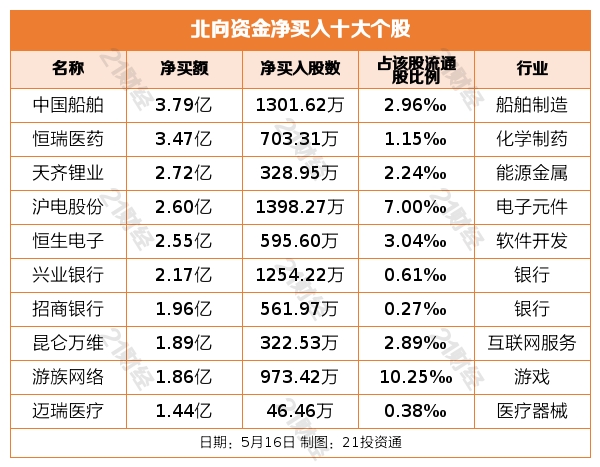 个股方面,北向资金净买入中国船舶(600150.SH)、恒瑞医药(600276.SH)、天齐锂业(002466.SZ)、沪电股份(002463.SZ)、恒生电子(600570.SH)居前,其中,中国船舶被净买入3.79亿元,恒瑞医药被净买入3.47亿元,天齐锂业被净买入2.72亿元,沪电股份被净买入2.60亿元,恒生电子被净买入2.55亿元。
