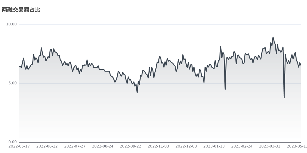 今日该指标值为6.53%,目前该指标处于近一年中立区间,说明投资者对A股持中立情绪。反映场内投资者借钱炒股的杠杆水平,该指标越高说明杠杆水平越高,即投资者认为当前市场较强,反之则说明投资者认为市场相对较弱,因而与上证指数存在较强的正相关性。