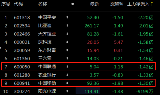 除了中国电信外,中国联通、中国移动盘中一度跌超3%,截至发稿,中国移动跌1.98%,中国联通跌1.18%,主力资金净流出中国联通、中国移动分别为1.42亿元和1.30亿元。