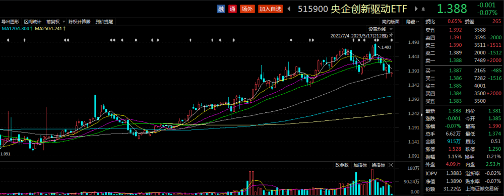 今日(5月17日),央企创新驱动ETF(515900)低开,盘中一度跌超1%,随后拉升,现跌0.07%。