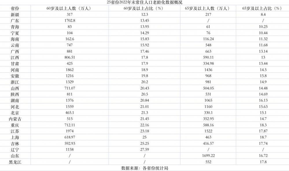 随着各省份2022年国民经济和社会发展统计公报相继发布,各地人口数据得以洞悉。在公开人口老龄化情况的25个省区市中,有13个省份60岁及以上人口占比超过19.8%的全国平均水平,辽宁、吉林、上海、江苏、重庆分列前五。