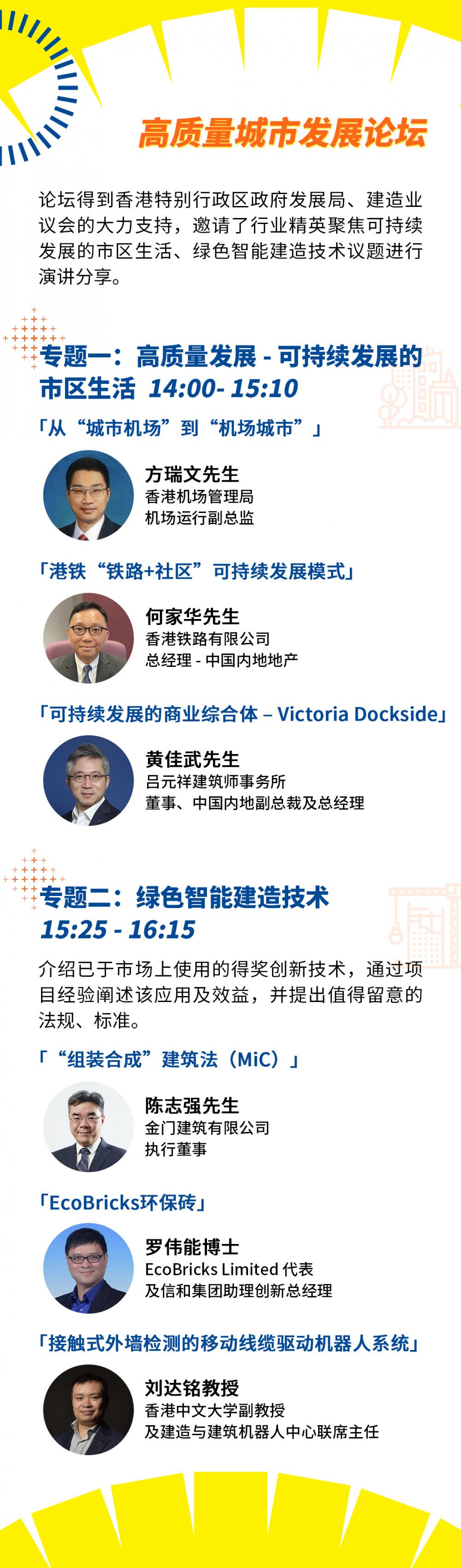 面对绿色高质量发展的要求,本届SmartHK“高质量城市发展”专题论坛的多位专家,将与大湾区企业分享经验,促进两地企业交流合作,充分运用香港建造业的优势及专业服务平台,共同构建可持续发展的智慧城市,推动大湾区高质量发展。