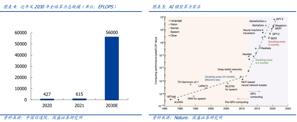 据中国信通院数据,2021年全球计算设备算力规模达到615EFLOPS,同比增长44%;华为 GIV 预测,2030 年人类有望迎来 YB 数据时代,全球算力规模达到 56 ZFLOPS,CAGR 达到 65%。