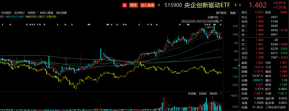 持有光迅科技的央企创新驱动ETF(515900)今日高开,盘中快速上涨,截至目前,央企创新驱动ETF(515900)涨超1%,盘中溢价交易。