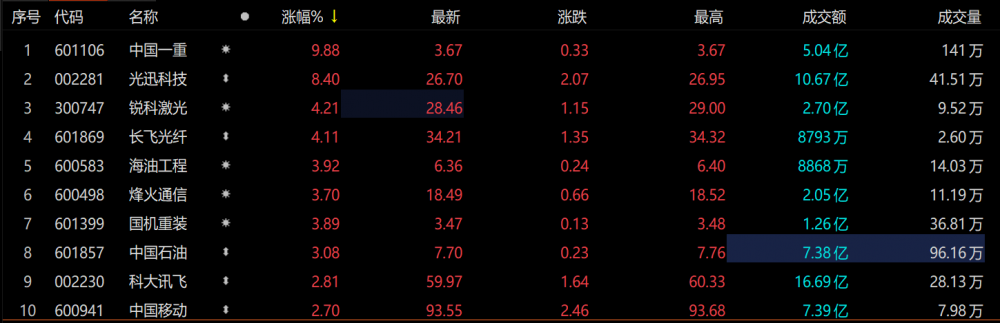 成分股多数上涨,除了光迅科技涨超8%外,中国一重盘中涨停,锐科激光、长飞光纤、海油工程、烽火通信、国机重装、中国石油等跟涨。