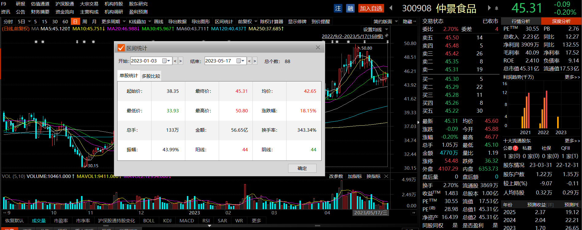 截至5月17日收盘,仲景食品股价报收45.31元/股,最新市值45.31亿元。据东方财富Choice数据统计,今年年初至今,仲景食品累计涨幅达18.15%。