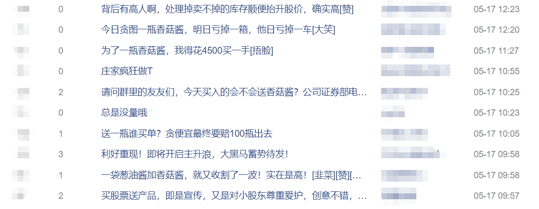 当然,也有股民唱衰,“今日贪图一瓶香菇酱,明日亏掉一箱,他日亏掉一车”;“背后有高人啊,处理不掉的库存顺便抬升股价,确实高”……