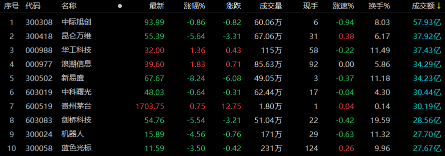 沪深两市半天成交额5489亿元,较上一交易日同期放量86亿元。个股方面,截至午间收盘,中际旭创成交额排名第一,达57.93亿元;昆仑万维、华工科技、浪潮信息、新易盛、中科曙光、贵州茅台成交额也在30亿元以上,分别为37.92、37.43、34.29、34.23、30.44、30.19亿元。