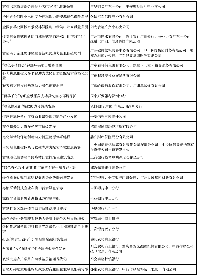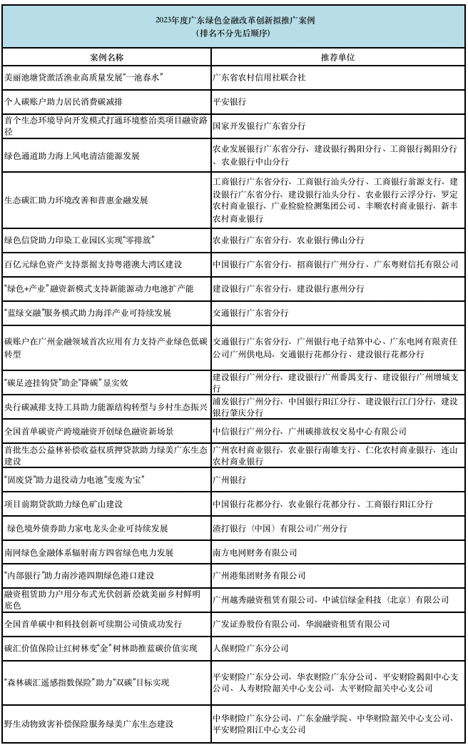 记者梳理50个拟推广案例名单发现,此次拟推广案例中,共涉及广州、深圳、东莞、佛山、珠海、中山、江门、韶关、清远、茂名、肇庆、云浮等12个地市;案例申报主体涵盖银行、证券、保险、信托、融资租赁、财务公司、企业集团、第三方绿色认证机构;案例类型涵盖绿色信贷、绿色保险、绿色债券、金融科技、跨境金融等,类型丰富。