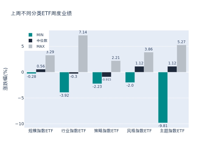 上周股票型ETF周度收益率中位数为0.6%。其中按照不同分类,规模指数中鹏华上证科创板50成份增强策略ETF周度收益率最高,为3.29%;行业指数中国泰中证全指通信设备ETF周度收益率最高,为7.14%;策略指数中华夏创业板低波价值ETF周度收益率最高,为2.21%;风格指数中嘉实新兴科技100ETF周度收益率最高,为3.86%;主题指数中富国中证芯片产业ETF周度收益率最高,为5.27%。