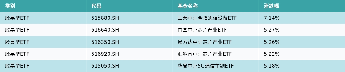 上周股票型ETF涨幅最高的5支ETF及其收益率分别为:国泰中证全指通信设备ETF(7.14%)、富国中证芯片产业ETF(5.27%)、易方达中证芯片产业ETF(5.26%)、汇添富中证芯片产业ETF(5.22%)、华夏中证5G通信主题ETF(5.18%)。详情见下表: