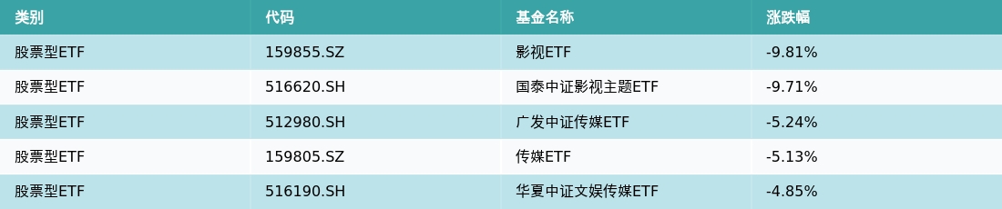 上周股票型ETF跌幅最大的5支ETF及其收益率分别为:影视ETF(-9.81%)、国泰中证影视主题ETF(-9.71%)、广发中证传媒ETF(-5.24%)、传媒ETF(-5.13%)、华夏中证文娱传媒ETF(-4.85%)。详情见下表: