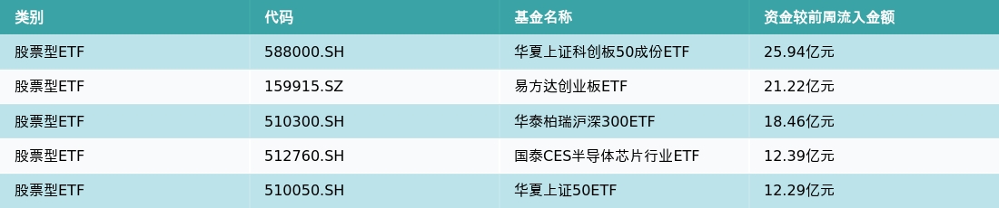 上周股票型ETF资金流入最多的5支ETF及其流入金额分别为:华夏上证科创板50成份ETF(流入25.94亿元)、易方达创业板ETF(流入21.22亿元)、华泰柏瑞沪深300ETF(流入18.46亿元)、国泰CES半导体芯片行业ETF(流入12.39亿元)、华夏上证50ETF(流入12.29亿元)。详情见下表: