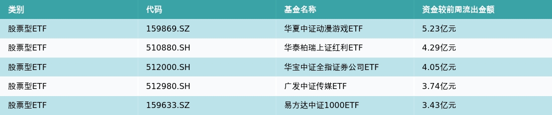 上周股票型ETF资金流出最多的5支ETF及其流入金额分别为:华夏中证动漫游戏ETF(流出5.23亿元)、华泰柏瑞上证红利ETF(流出4.29亿元)、华宝中证全指证券公司ETF(流出4.05亿元)、广发中证传媒ETF(流出3.74亿元)、易方达中证1000ETF(流出3.43亿元)。详情见下表: