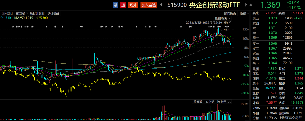 ETF方面,央企创新驱动ETF(515900)低开,现跌超1%,盘中成交额为3679万元。