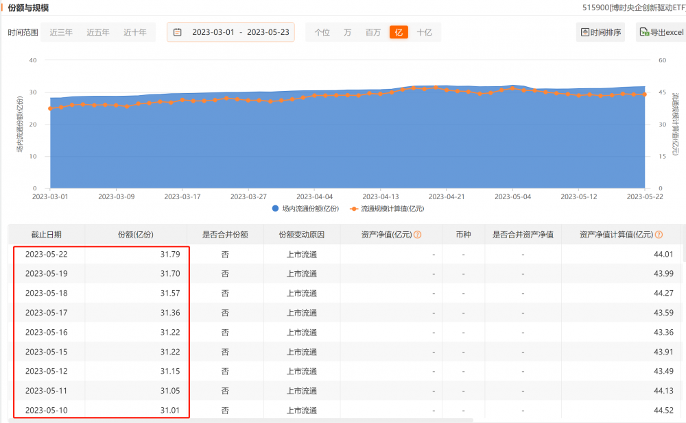 央企创新驱动ETF(515900)自5月10日以来下跌超5%,期间份额出现小幅增加。截至5月22日,该ETF份额为31.79亿份,资产净值计算值破44亿元。