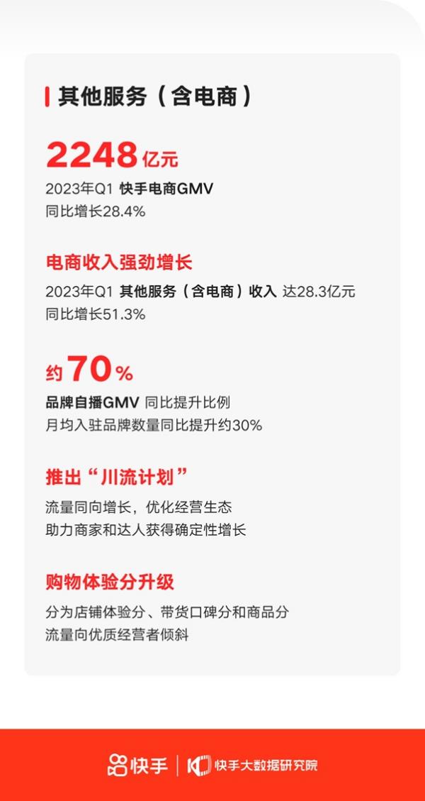 一季度,快手月均入驻品牌数量同比提升约30%,品牌自播GMV同比提升约70%。