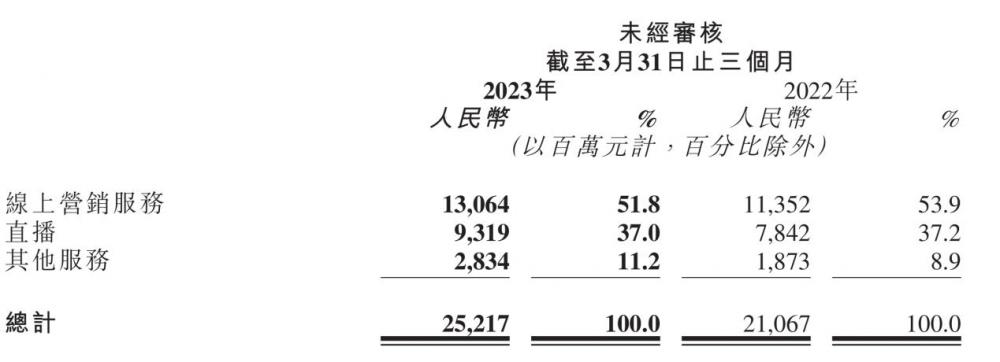 快手第一大收入源为线上营销服务业务,一季度收入为131亿元,同比增长15.1%;直播业务收入为93亿元,同比增加18.8%;来自电商等业务的其他服务收入,在三大业务中增速最高,同比增长51.3%至28亿元。