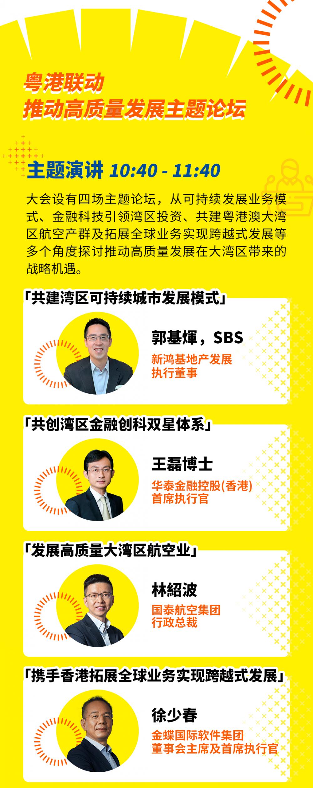 此外,多位知名商界领袖将发表演讲,包括新鸿基地产发展有限公司执行董事郭基煇、华泰金融控股(香港)有限公司首席执行官王磊、国泰航空集团行政总裁林绍波以及金蝶国际软件集团董事会主席及首席执行官徐少春,为与会者提供最新市场信息及商贸网络,展示香港的优质服务及创新实力,剖析粤港合作新路向。
