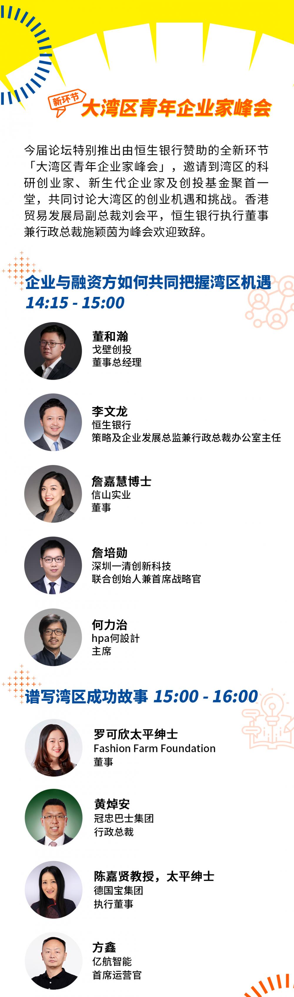 本届SmartHK进一步关注人才高地建设,特别推出了全新环节“大湾区青年企业家峰会”,鼓励湾区的科研创业家、新生代企业家及创投基金等嘉宾共同讨论大湾区的创业机遇和挑战。他们将就“企业与融资方如何共同把握湾区机遇”和“谱写湾区成功故事”两大议题分享各自的观点。