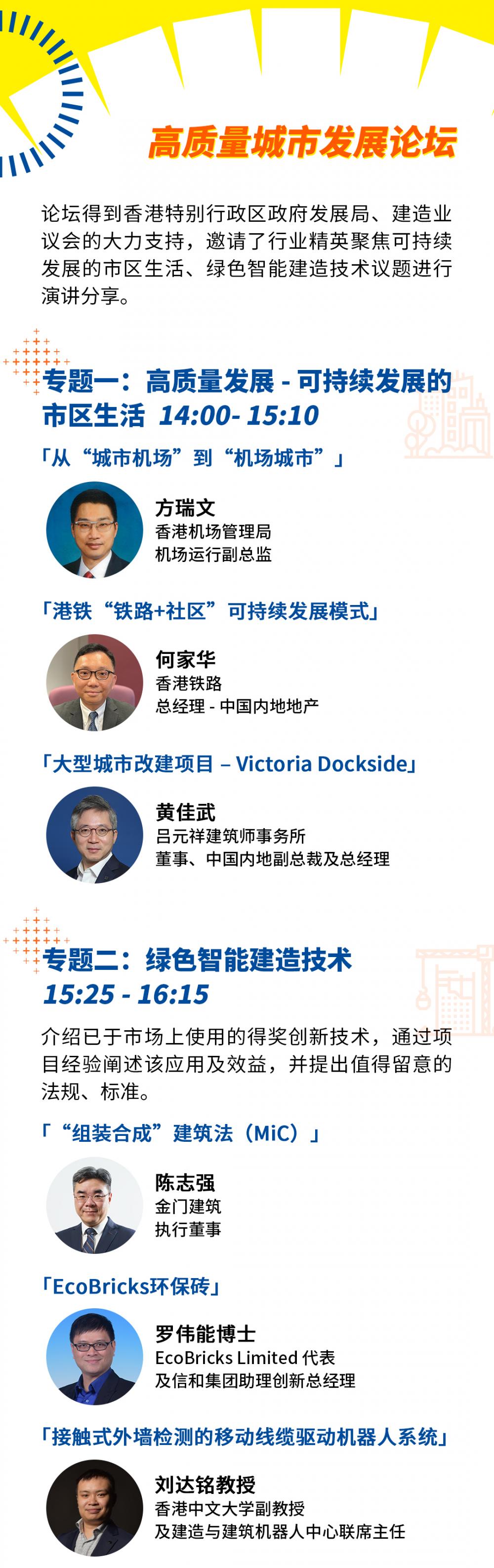 在金融专题论坛上,多位嘉宾将围绕“把握投资新机遇、开拓海外新商机”,助力湾区高质量发展等方面分享真知灼见。在高质量城市发展论坛上,多位香港专家将与大湾区企业分享经验,促进两地企业交流合作,充分运用香港建造业的优势及专业服务平台,共同构建可持续发展的智慧城市,推动湾区高质量发展。