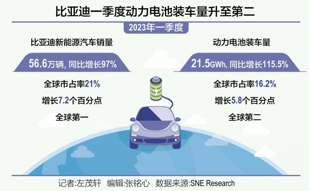 2023年第一季度,全球各国注册的新能源汽车总数约为270.2万辆,同比增长30.2%。其中,比亚迪和特斯拉分居前两位。比亚迪以97.0%的同比增长蝉联榜首,销量达到56.6万辆,在全球的市占率为21.0%,特斯拉一季度也实现了36.4%的同比增长,全球销量为42.3万辆,市场份额为15.6%。