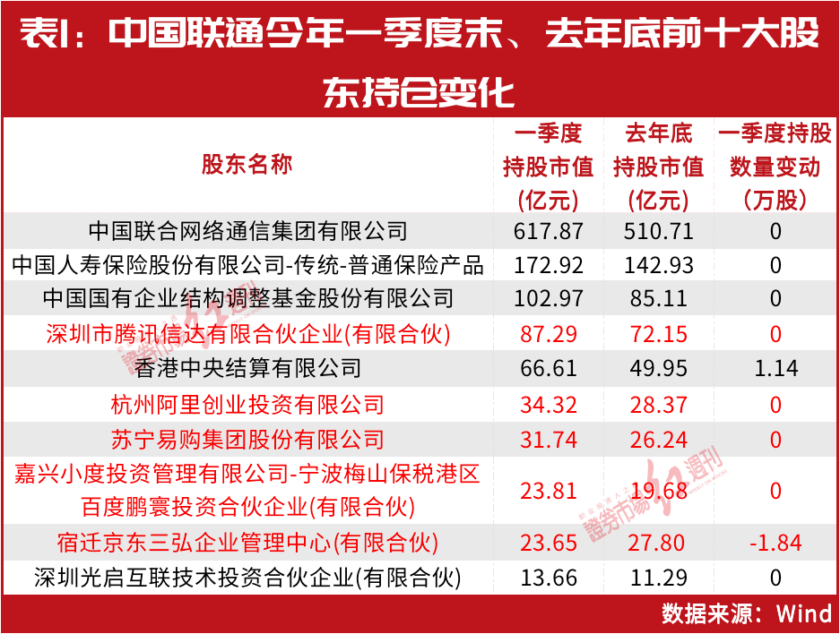 而这也让布局其中的投资者收获颇丰,其中更是不乏明星资本。如中国联通,在公司今年一季度末的前十大股东名单中,“腾讯系”、“阿里系”、“苏宁系”、“百度系”和“京东系”等公司均再次现身,并且在持股数量相较去年四季度末普遍没有变动的情况下,多数持股市值增长明显,分别增长15.14亿元、5.95亿元、5.51亿元、4.13亿元和-4.14亿元(见表1)。其中,“京东系”持股市值的减少,主要是因为宿迁京东三弘企业管理中心(有限合伙)(以下简称“京东三弘”)继去年第四季度期间减持中国联通1.12亿股之后,在今年一季度期间再次减持了1.84亿股。
