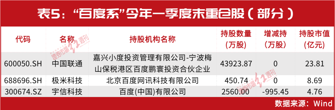 “百度系”和“京东系”则在围绕产业链布局,如主打人工智能领域的“百度系”就主要在围绕这个方向,同时重仓了国内智能投影设备行业龙头极米科技和“银行数据+AI第一股”宇信科技(见表5)。