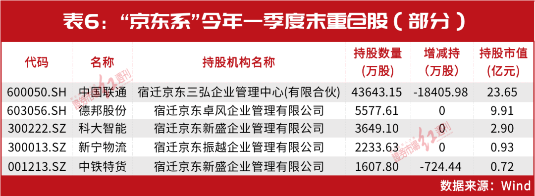 仓储物流龙头“京东系”则重仓了快递行业公司德邦股份、智能物流公司科大智能、综合物流服务公司新宁物流、冷链物流公司中铁特货(见表6)。