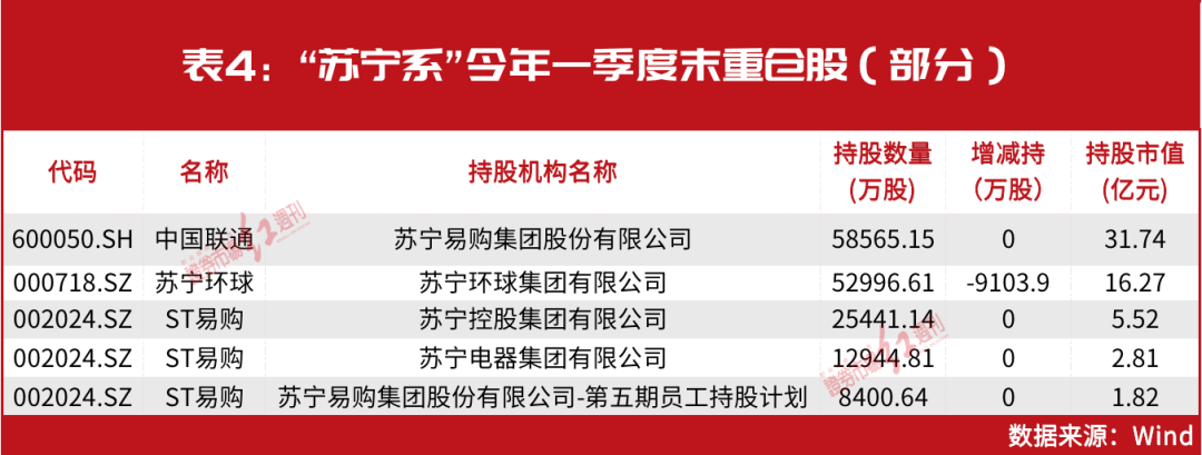 据梳理,“苏宁系”还重仓了苏宁环球和ST易购,均为自家产业(见表4)。其中,“苏宁系”掌门人张近东的胞兄张桂平重仓持有苏宁环球,“苏宁系”的苏宁控股集团有限公司、苏宁电器集团有限公司以及苏宁易购集团股份有限公司-第五期员工持股计划联合重仓了ST易购。在这之外,张近东同样为ST易购的前十大股东之一,并且位列第二。