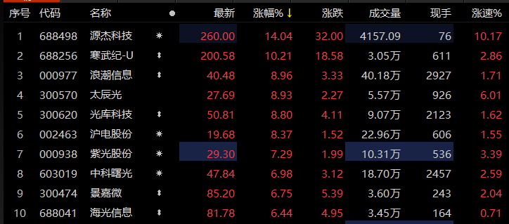 今日(5月25日)早盘,芯片板块出现快速拉升,截至发稿,被称为国内“AI芯片第一股”的寒武纪涨超10%,股价再度突破200元关口。源杰科技涨逾14%,浪潮信息、太辰光、光库科技等涨近9%,沪电股份、紫光股份、中科曙光、景嘉微、海光信息等大幅走强。