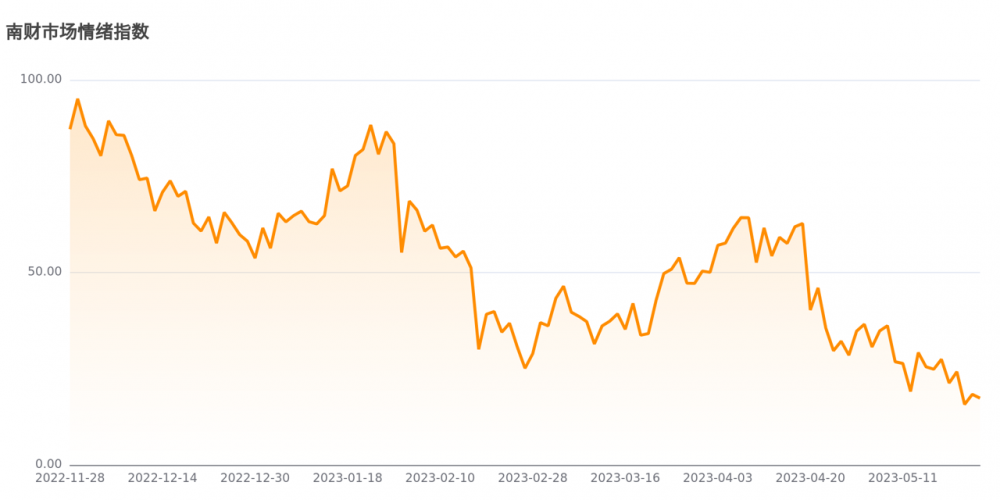 今日南财市场情绪指数为17.4,较前一交易日18.3基本不变,市场投资热度较低。